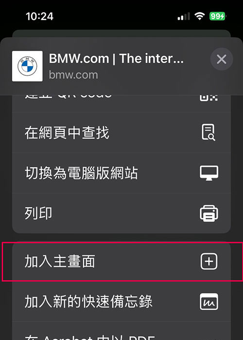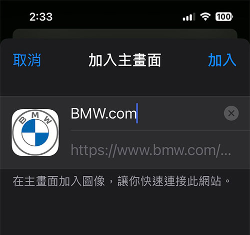 輸入網址,按下分享鈕後請按[新增至主畫面]的按鈕,確認後即可在桌面看到一個圖示,點擊即可執行。