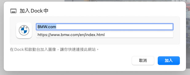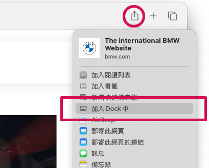 輸入網址,按下分享按鈕,選擇"加入DOCK中"